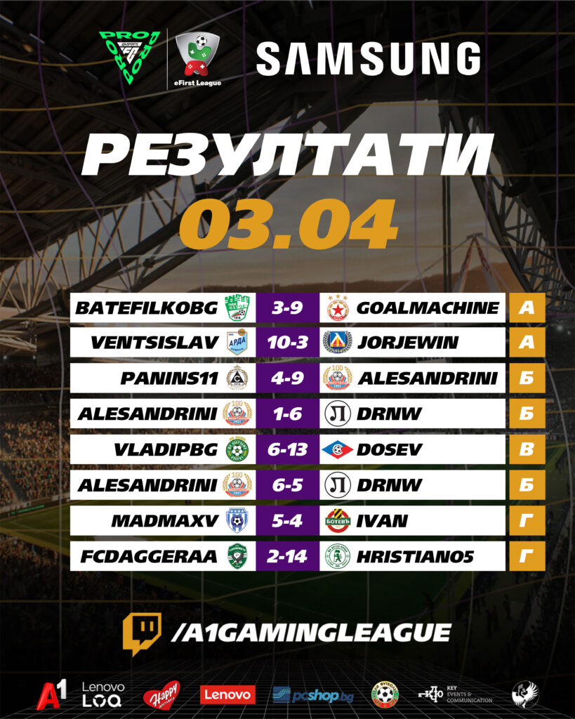 Така те са първите двама, които си осигуриха място в директните елиминации, които ще се играят на LAN на 25 и 26 април, благодарение на генералната подкрепа на SAMSUNG, както и технологичните възможонсти, осигурени от Lenovo LOQ, TP-Link и PC Shop. Шампионът в електронното първенство по футбол на България ще се класира за Плей-Инс на FC Pro световния шампионат и еШампионска лига, което означава, че победителят в eFirst League ще има възможността да участва на Световното първенство и в най-силния клубен турнир в Европа. Той ще спечели и голямата награда от общия награден фонд на стойност 5 хил. евро, осигурен от партьорите на лигата, сред които е и Happy Доставка. На трето и четвърто място в групата остават тимовете на „Спартак“ Варна с представител бившия национал на Българи Илия Стоянов и „Славия“, чийто цветове защитава Иван Димитров.
